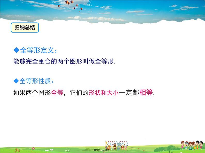 全等形性质:如果两个图形全等,它们的形状和大小一定都相等.