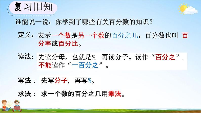 谁能说一说:你学到了哪些有关百分数的知识?定义:表示一个数是另一个数的百分之几,百分数也叫 百分率或百分比。读法:先读分母,也就是 ,再读分子。读作“百分之”, 不能读作“一百分之”。写法: 先写分子,再写 。