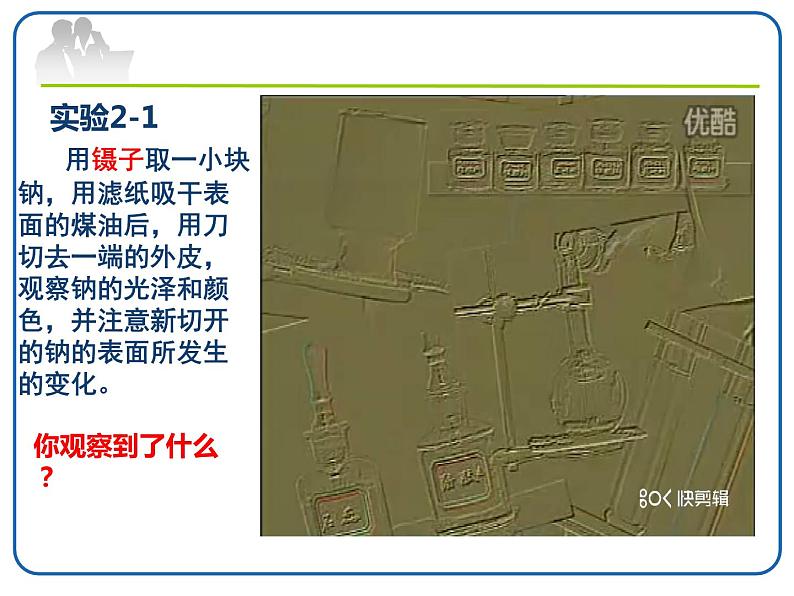 用镊子取一小块钠,用滤纸吸干表面的煤油后,用刀切去一端的外皮,观察钠的光泽和颜色,并注意新切开的钠的表面所发生的变化。