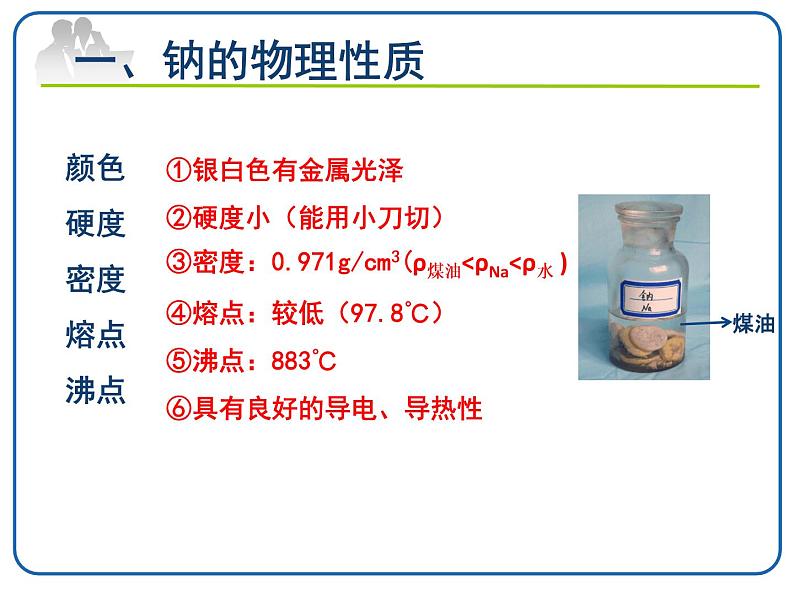 ①银白色有金属光泽②硬度小(能用小刀切)③密度:0.971g/cm3(ρ煤油