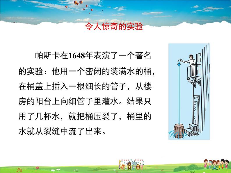 帕斯卡在1648年表演了一个著名的实验:他用一个密闭的装满水的桶,在桶盖上插入一根细长的管子,从楼房的阳台上向细管子里灌水。结果只用了几杯水,就把桶压裂了,桶里的水就从裂缝中流了出来。