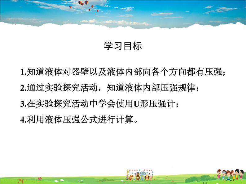1.知道液体对器壁以及液体内部向各个方向都有压强;2.通过实验探究活动,知道液体内部压强规律;3.在实验探究活动中学会使用U形压强计;4.利用液体压强公式进行计算。