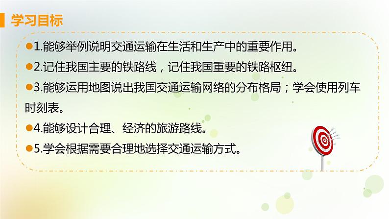 1.能够举例说明交通运输在生活和生产中的重要作用。2.记住我国主要的铁路线,记住我国重要的铁路枢纽。3.能够运用地图说出我国交通运输网络的分布格局;学会使用列车 时刻表。4.能够设计合理、经济的旅游路线。5.学会根据需要合理地选择交通运输方式。