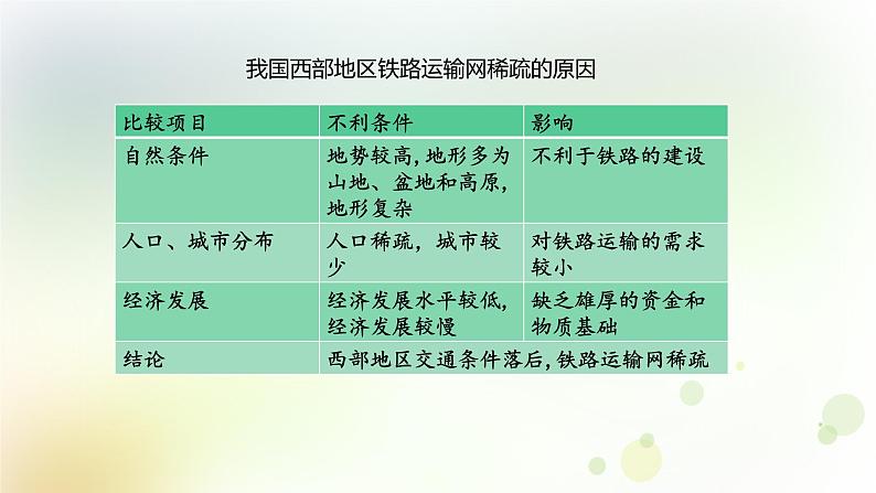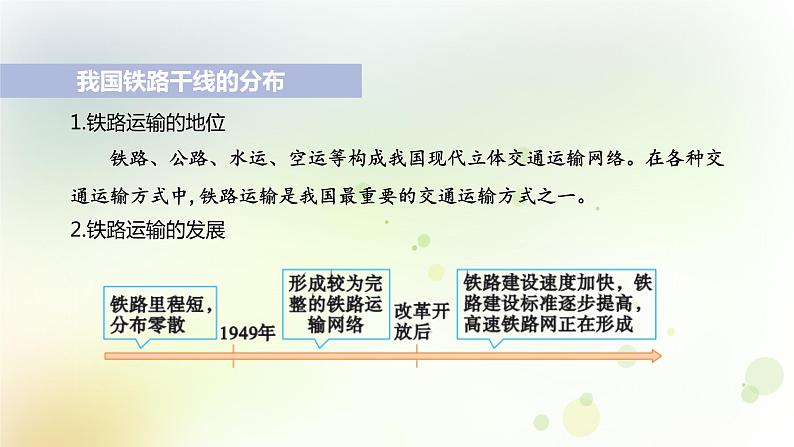 1.铁路运输的地位 铁路、公路、水运、空运等构成我国现代立体交通运输网络。在各种交通运输方式中,铁路运输是我国最重要的交通运输方式之一。2.铁路运输的发展