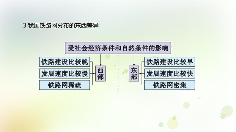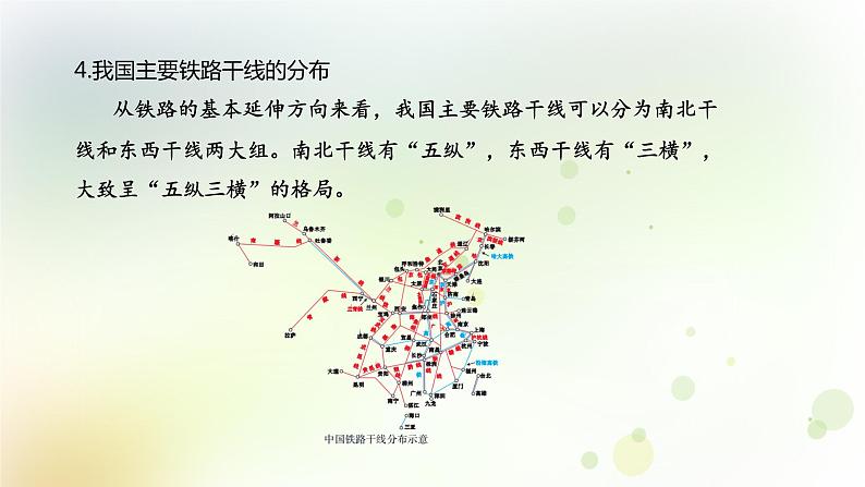 4.我国主要铁路干线的分布 从铁路的基本延伸方向来看,我国主要铁路干线可以分为南北干线和东西干线两大组。南北干线有“五纵”,东西干线有“三横”,大致呈“五纵三横”的格局。