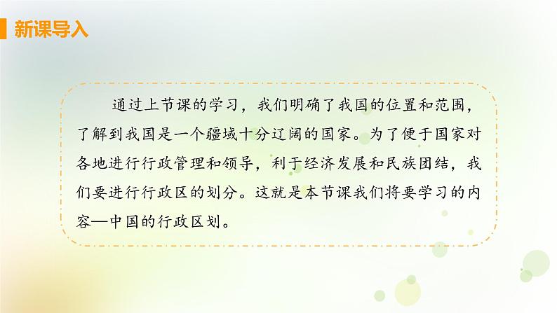 通过上节课的学习,我们明确了我国的位置和范围,了解到我国是一个疆域十分辽阔的国家。为了便于国家对各地进行行政管理和领导,利于经济发展和民族团结,我们要进行行政区的划分。这就是本节课我们将要学习的内容—中国的行政区划。
