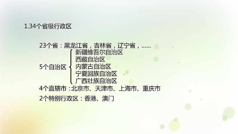 23个省:黑龙江省,吉林省,辽宁省,……5个自治区4个直辖市:2个特别行政区:香港、澳门