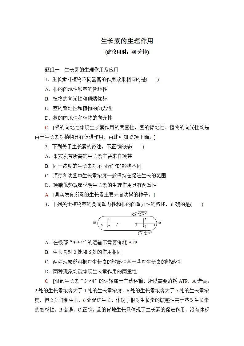 2020-2021学年第3章 植物的激素调节第2节 生长素的生理作用精品课时训练