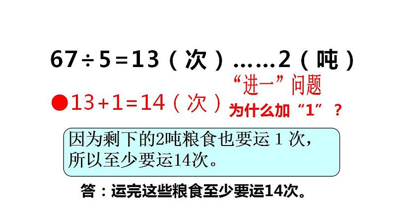 有67吨粮食要运送到灾区,汽车每次只能运5吨,送完这些粮食,汽车至少要运多少次?