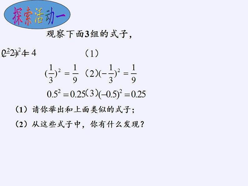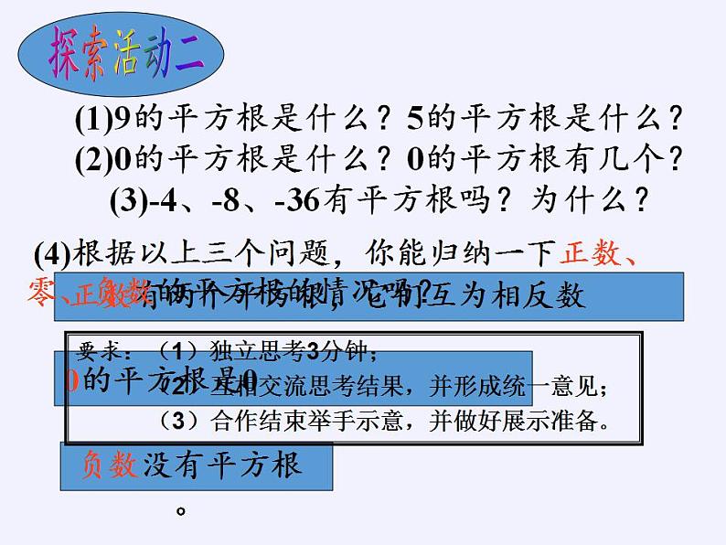(4)根据以上三个问题,你能归纳一下正数、零、负数的平方根的情况吗?