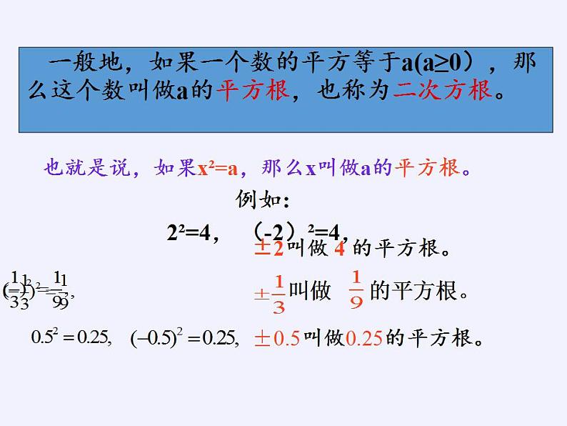 也就是说,如果x²=a,那么x叫做a的平方根。例如: 2²=4, (-2)²=4,