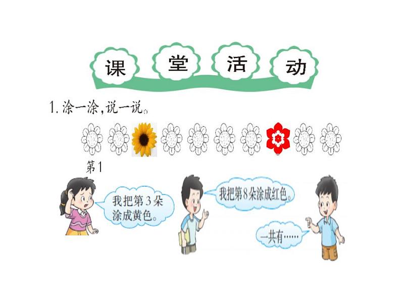 一共( )面小旗,第( )面小旗是红色。把第5面小旗涂上黄色。