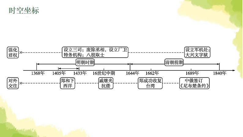 这是一份历史中考复习 1. 板块一 中国古代史 7. 第七单元 明清时期:统一多民族国家的巩固与发展 PPT课件,共49页。PPT课件主要包含了世纪中期,康熙帝,乾隆帝,明朝建立,努尔哈赤建立后金,后金改国号为清,明朝灭亡清军入关,郑和下西洋,郑成功收复台湾,法国大革命开始等内容,欢迎下载使用。