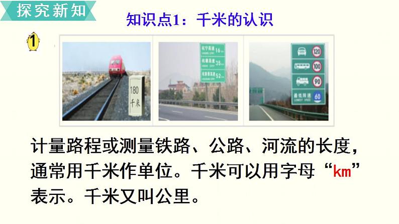 计量路程或测量铁路、公路、河流的长度,通常用千米作单位。千米可以用字母“km”表示。千米又叫公里。