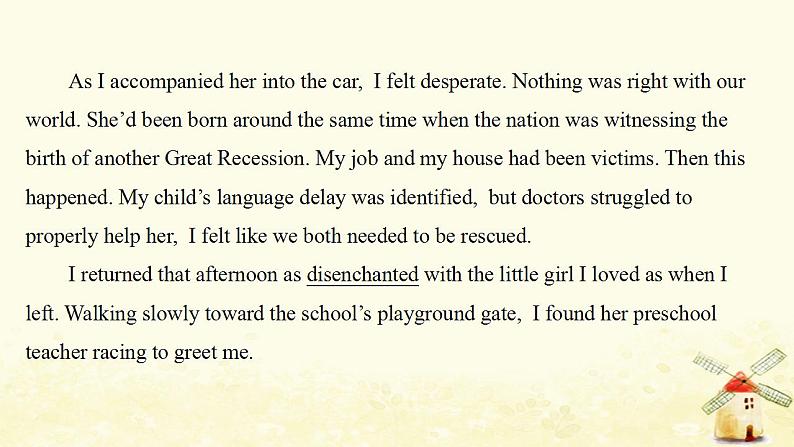 2. Which f the fllwing best explains the underlined “disenchanted” in Paragraph 3? A. Happy. B. Cncerned. C. Careful. D. Disappinted. 【解析】选D。词义猜测题。根据第二段“As I accmpanied her int the car, I felt desperate. ”和第三段的第一句可知, 作者送孩子上学的感受和接孩子时的感受应该是一样的。由此可推断, 画线词与disappinted意思最为接近。