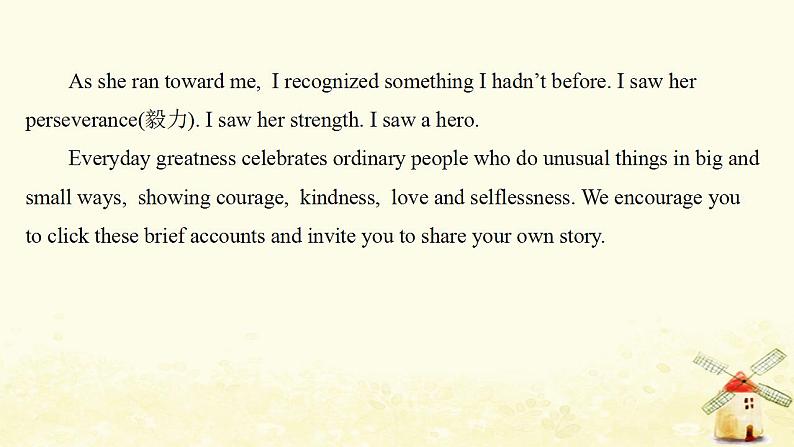 As she ran tward me, I recgnized smething I hadn’t befre. I saw her perseverance(毅力). I saw her strength. I saw a her. Everyday greatness celebrates rdinary peple wh d unusual things in big and small ways, shwing curage, kindness, lve and selflessness. We encurage yu t click these brief accunts and invite yu t share yur wn stry.