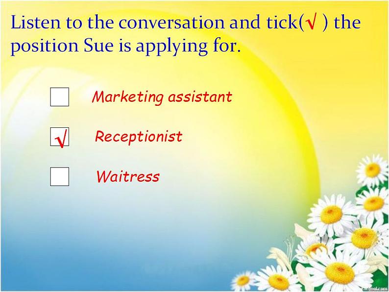 Listen t the cnversatin and tick(√ ) the psitin Sue is applying fr.