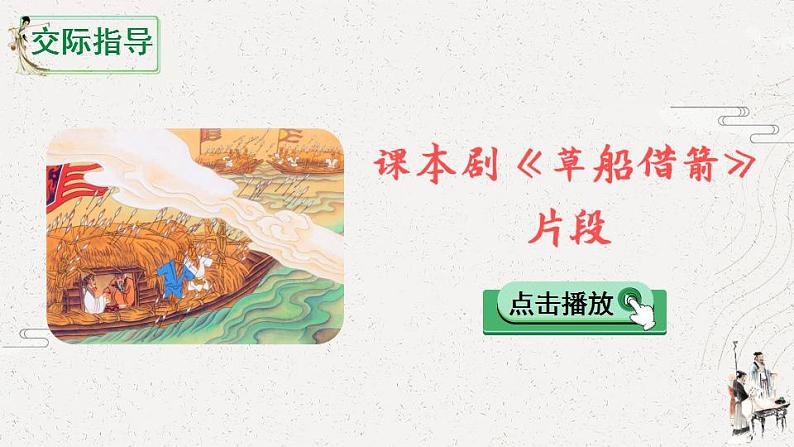 [周瑜对诸葛亮心怀妒忌。有一天,周瑜请诸葛亮商议军事。]周瑜:我们就要跟曹军交战了。水上交战,用什 么兵器最好? 诸葛亮:(坚定地说)用弓箭最好。 周瑜:对,先生跟我想的一样。可现在军中缺箭, 想请先生负责赶造十万支箭。这是公事,希 望先生不要推却。