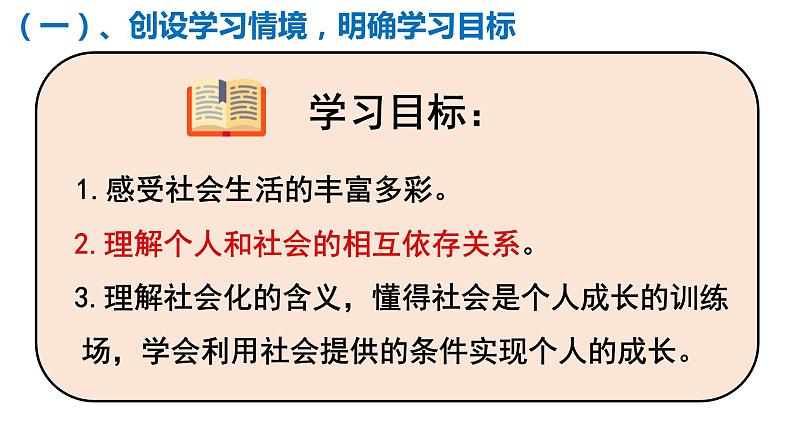 学习目标: 1.感受社会生活的丰富多彩。 2.理解个人和社会的相互依存关系。 3.理解社会化的含义,懂得社会是个人成长的训练场,学会利用社会提供的条件实现个人的成长。