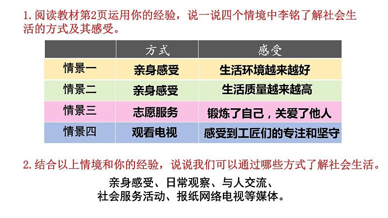 1.阅读教材第2页运用你的经验,说一说四个情境中李铭了解社会生活的方式及其感受。