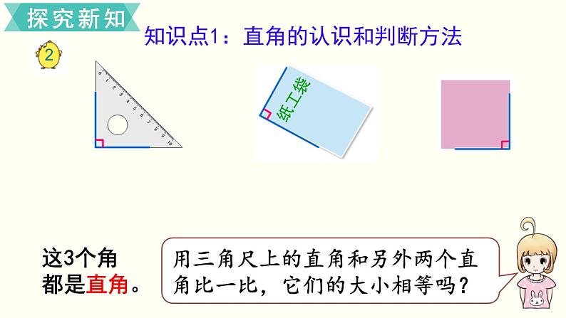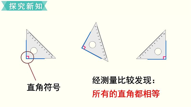 1.三角尺上最大的角是直角,所有的直角都相等。2.用直角尺上的直角判断一个角是不是直角的方法:顶点对顶点,一条边对一条边,再看另一边。3.锐角比直角小,钝角比直角大。
