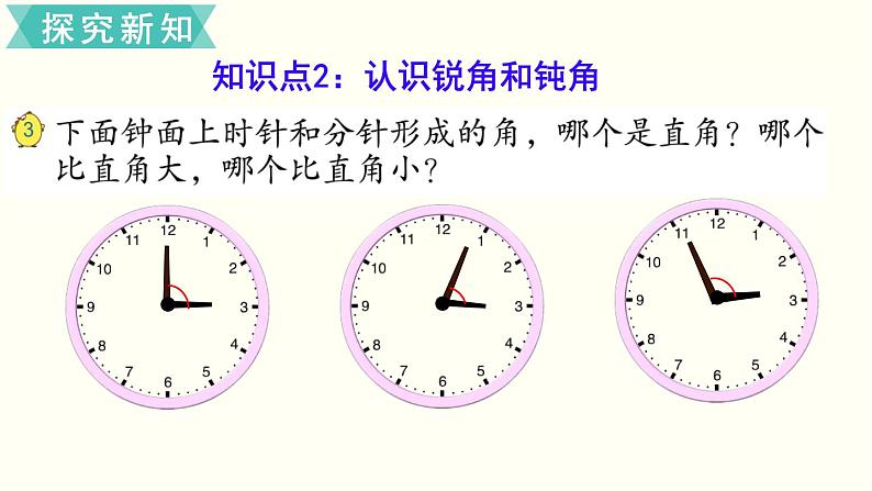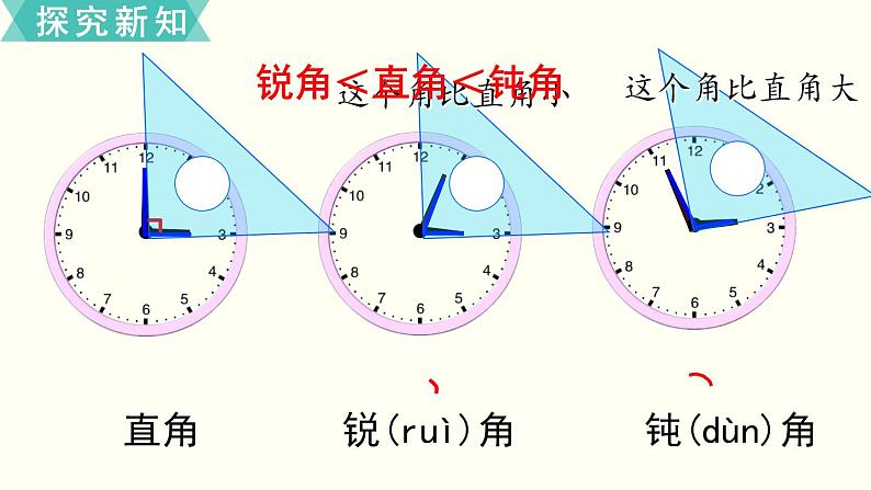 小学苏教版七 角的初步认识教课ppt课件: 这是一份小学苏教版七 角的初步认识教课ppt课件,共24页。PPT课件主要包含了这3个角都是直角,锐ruì角,钝dùn角,这个角比直角小,这个角比直角大,锐角<直角<钝角,个锐角,个钝角,个直角等内容,欢迎下载使用。