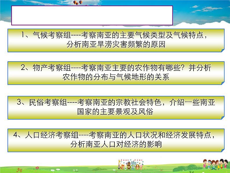 4、人口经济考察组----考察南亚的人口状况和经济发展特点,分析南亚人口对经济的影响