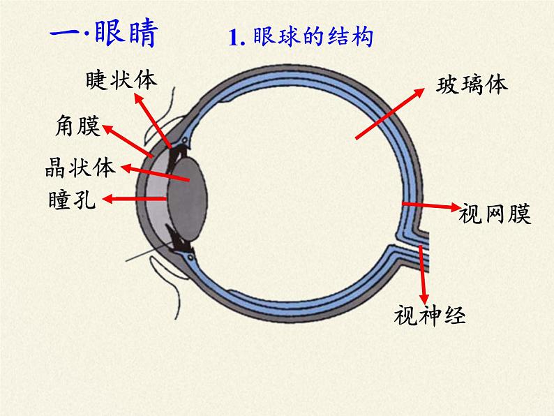 一、眼睛1·眼球的基本构造2·人眼看物原理:相当于照相机3·眼球—靠改变晶状体形状来改变焦距