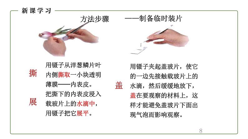 1.玻片标本:切片、涂片、装片2.制作洋葱鳞片叶内表皮细胞临时装片: