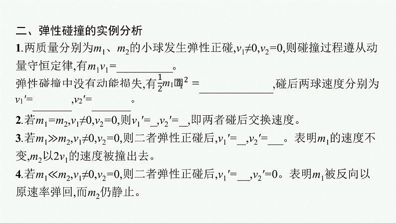 二、弹性碰撞的实例分析1.两质量分别为m1、m2的小球发生弹性正碰,v1≠0,v2=0,则碰撞过程遵从动量守恒定律,有m1v1=m1v1'+m2v2'。弹性碰撞中没有动能损失,有 ,碰后两球速度分别为2.若m1=m2,v1≠0,v2=0,则v1'=0,v2'=v1,即两者碰后交换速度。3.若m1≫m2,v1≠0,v2=0,则二者弹性正碰后,v1'=v1,v2'=2v1。表明m1的速度不变,m2以2v1的速度被撞出去。4.若m1≪m2,v1≠0,v2=0,则二者弹性正碰后,v1'=-v1,v2'=0。表明m1被反向以原速率弹回,而m2仍静止。