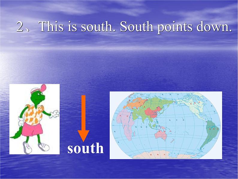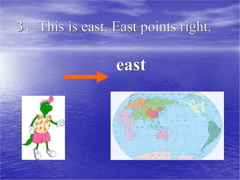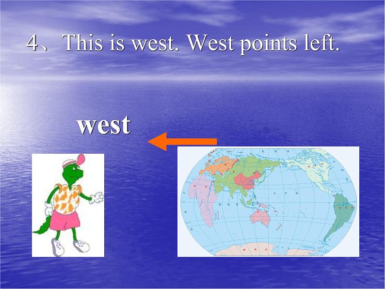 1、This is nrth. Nrth pints up n a map. 这个方向是北。在地图上向上的方向是北。2、This is suth. Suth pints dwn. 这个方向是南。向下的方向是南。3、This is east. East pints right. 这个方向是东。向右的方向是东。4、This is west. West pints left. 这个方向是西。向左的方向是西。