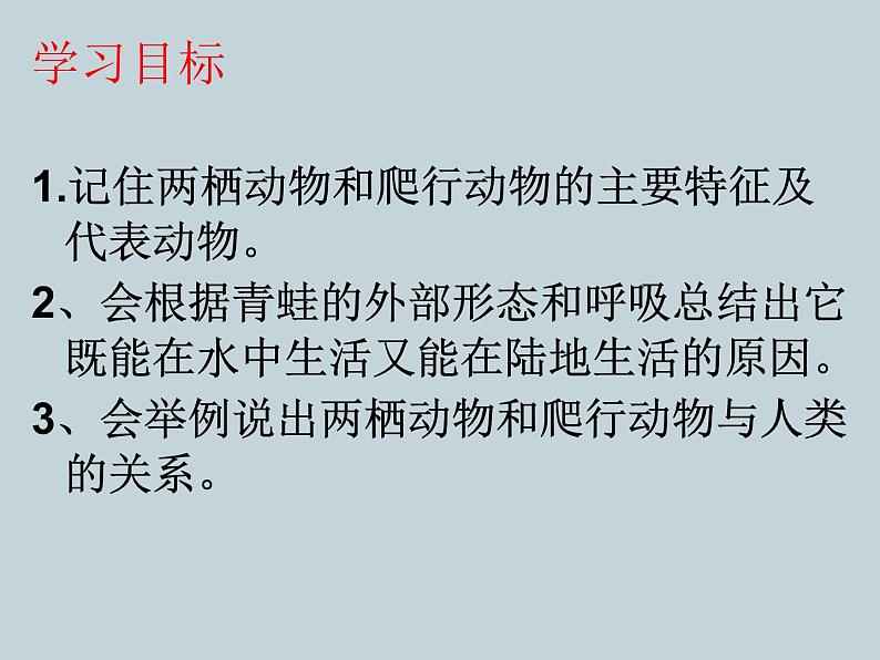 1.记住两栖动物和爬行动物的主要特征及代表动物。2、会根据青蛙的外部形态和呼吸总结出它既能在水中生活又能在陆地生活的原因。3、会举例说出两栖动物和爬行动物与人类的关系。