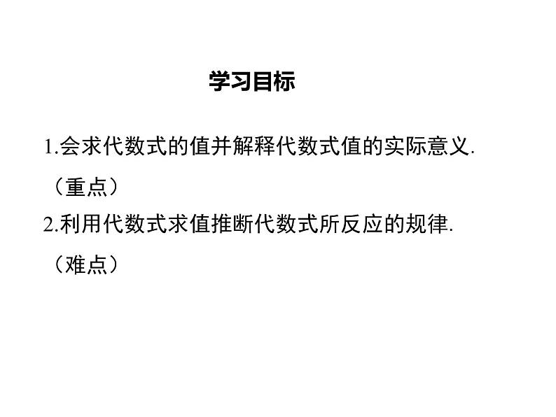 1.会求代数式的值并解释代数式值的实际意义.(重点)2.利用代数式求值推断代数式所反应的规律.(难点)