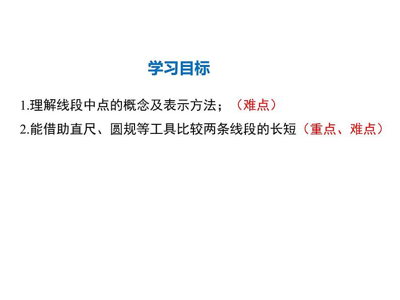 1.理解线段中点的概念及表示方法;(难点)2.能借助直尺、圆规等工具比较两条线段的长短(重点、难点)