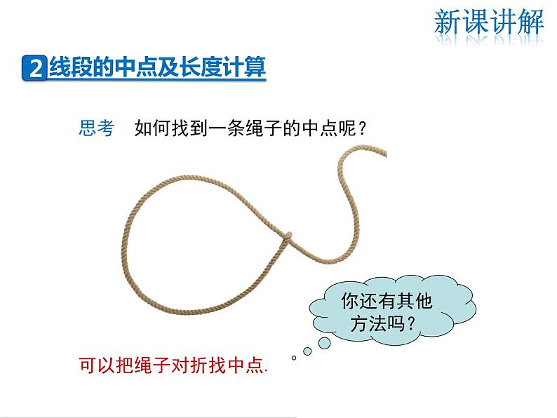这是一份华师大版七年级上册2 线段的长短比较授课课件ppt,共16页。PPT课件主要包含了线段的比较,第二种方法是叠合法,用折叠法,线段的中点,1ACCB,中点应用,还有其他的解法吗等内容,欢迎下载使用。