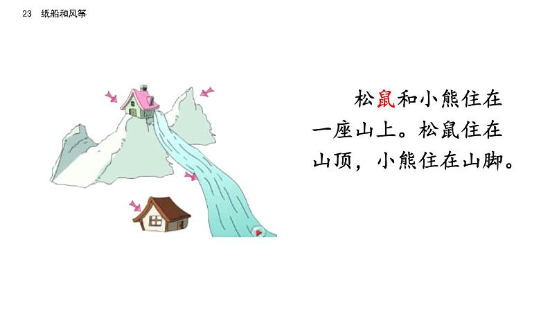 松鼠折了一只纸船,放在小溪里。纸船漂哇漂,漂到小熊家门口。