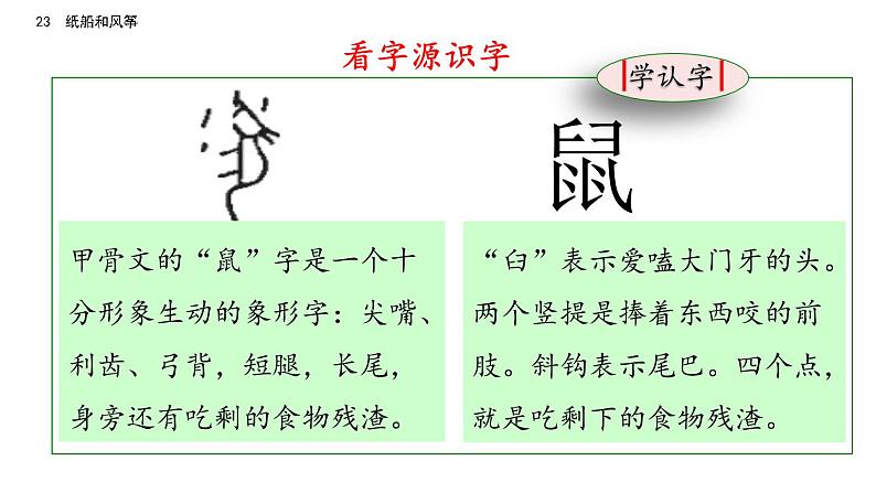 甲骨文的“鼠”字是一个十分形象生动的象形字:尖嘴、利齿、弓背,短腿,长尾,身旁还有吃剩的食物残渣。