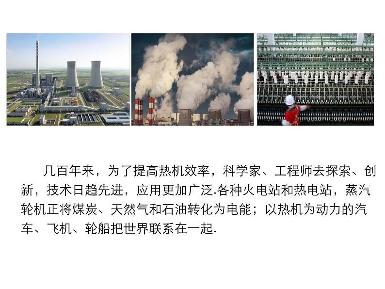几百年来,为了提高热机效率,科学家、工程师去探索、创新,技术日趋先进,应用更加广泛.各种火电站和热电站,蒸汽轮机正将煤炭、天然气和石油转化为电能;以热机为动力的汽车、飞机、轮船把世界联系在一起.三、【思考与探究】