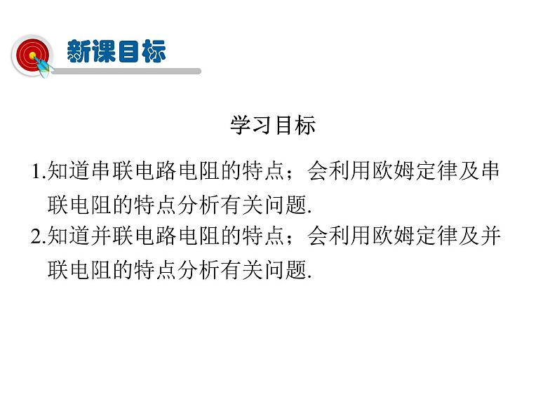 1.知道串联电路电阻的特点;会利用欧姆定律及串联电阻的特点分析有关问题.2.知道并联电路电阻的特点;会利用欧姆定律及并联电阻的特点分析有关问题.