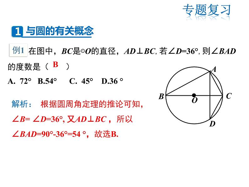 在图中,BC是⊙O的直径,AD⊥BC,若∠D=36°,则∠BAD的度数是( )A. 72° B.54° C. 45° D.36 °