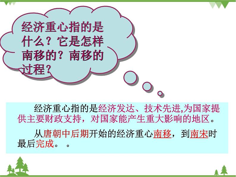 经济重心指的是经济发达、技术先进,为国家提供主要财政支持,对国家能产生重大影响的地区。 从唐朝中后期开始的经济重心南移,到南宋时最后完成。 。