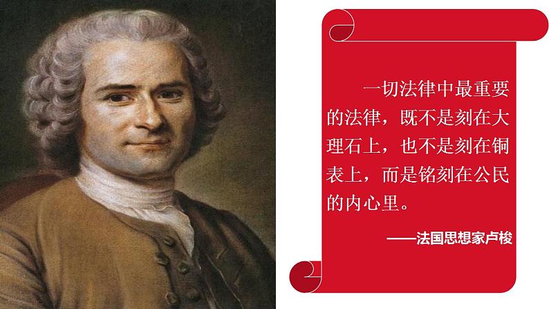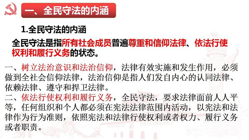 一、【新课导入】一切法律中最重要的法律,既不是刻在大理石上,也不是刻在铜表上,而是铭刻在公民的内心里——法国思想家卢梭。二、【课程的主要内容】全民守法的内涵:全民守法是指所有社会成员普遍尊重和信仰法律、依法行使权力和履行义务的状态。一、树立法治意识和法治信仰,法律有效实施和发生作用,必须做到全社会信仰法律,法治信仰是指人们发自内心的认同法律、依赖法律、遵守和捍卫法律。二、依法行使权力和义务,全民守法,要求法律面前人人平等,任何组织和个人都必须在宪法法律范围内活动,以宪法和法律作为行为准则,依照宪法和法律行使权利或者权力、履行义务或者职责。