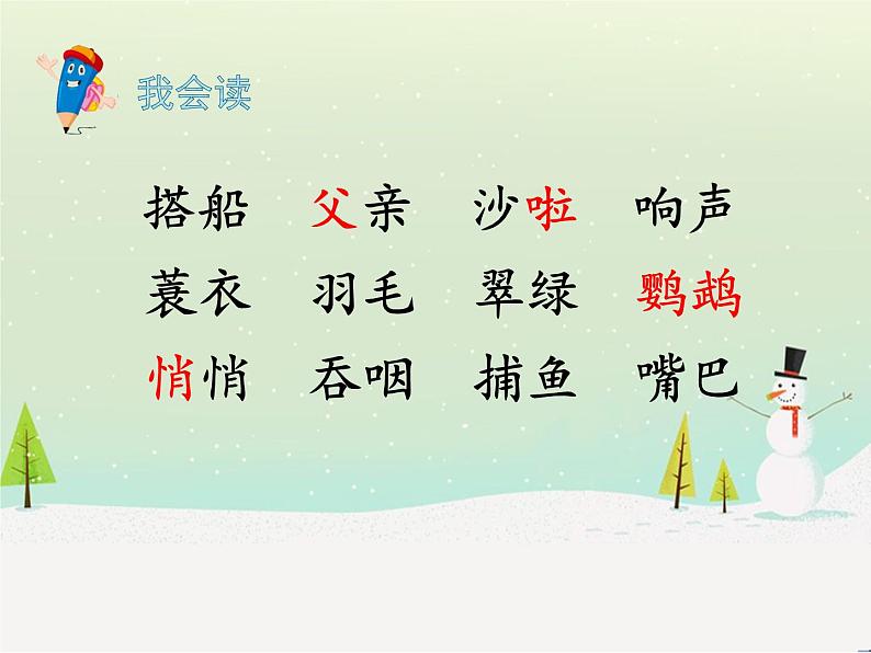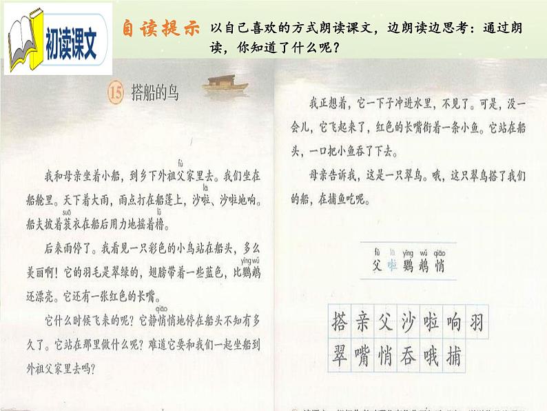 搭船 父亲 沙啦 响声 蓑衣 羽毛 翠绿 鹦鹉 悄悄 吞咽 捕鱼 嘴巴