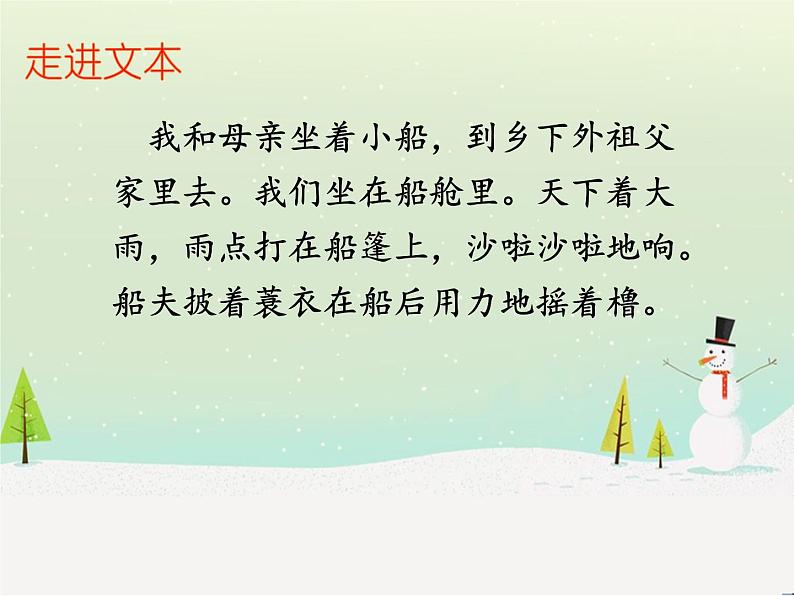 我和母亲坐着小船,到乡下外祖父家里去。我们坐在船舱里。天下着大雨,雨点打在船篷上,沙啦沙啦地响。船夫披着蓑衣在船后用力地摇着橹。