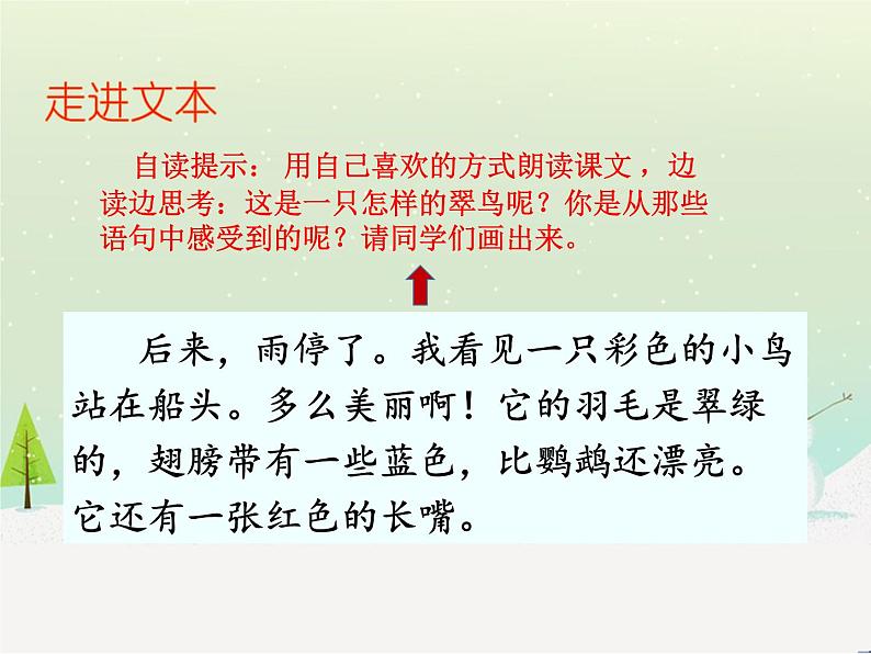 自读提示: 用自己喜欢的方式朗读课文 ,边读边思考:这是一只怎样的翠鸟呢?你是从那些语句中感受到的呢?请同学们画出来。
