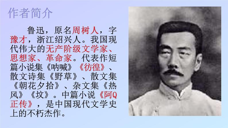 鲁迅,原名周树人,字豫才,浙江绍兴人。我国现代伟大的无产阶级文学家、思想家、革命家。代表作短篇小说集《呐喊》《彷徨》、散文诗集《野草》、散文集《朝花夕拾》、杂文集《热风》《坟》。中篇小说《阿Q正传》,是中国现代文学史上的不朽杰作。