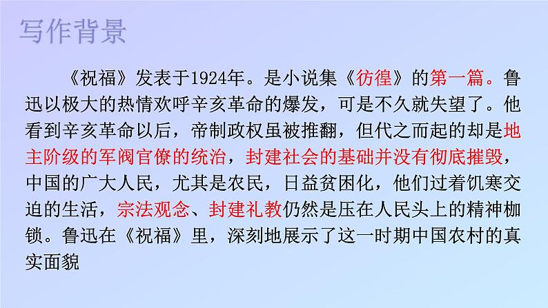 《祝福》发表于1924年。是小说集《彷徨》的第一篇。鲁迅以极大的热情欢呼辛亥革命的爆发,可是不久就失望了。他看到辛亥革命以后,帝制政权虽被推翻,但代之而起的却是地主阶级的军阀官僚的统治,封建社会的基础并没有彻底摧毁,中国的广大人民,尤其是农民,日益贫困化,他们过着饥寒交迫的生活,宗法观念、封建礼教仍然是压在人民头上的精神枷锁。鲁迅在《祝福》里,深刻地展示了这一时期中国农村的真实面貌