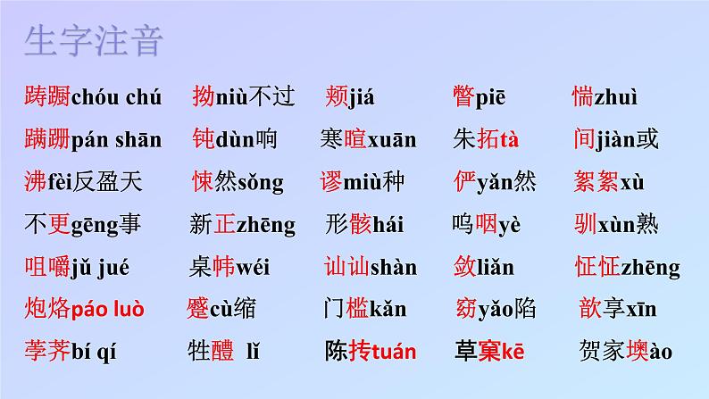 踌蹰chóu chú 拗niù不过 颊jiá 瞥piē 惴zhuì 蹒跚pán shān 钝dùn响 寒暄xuān 朱拓tà 间jiàn或沸fèi反盈天 悚然sǒng 谬miù种 俨yǎn然 絮絮xù不更gēng事 新正zhēng 形骸hái 呜咽yè 驯xùn熟 咀嚼jǔ jué 桌帏wéi 讪讪shàn 敛liǎn 怔怔zhēng炮烙pá luò 蹙cù缩 门槛kǎn 窈yǎ陷 歆享xīn荸荠bí qí 牲醴 lǐ 陈抟tuán 草窠kē 贺家墺à