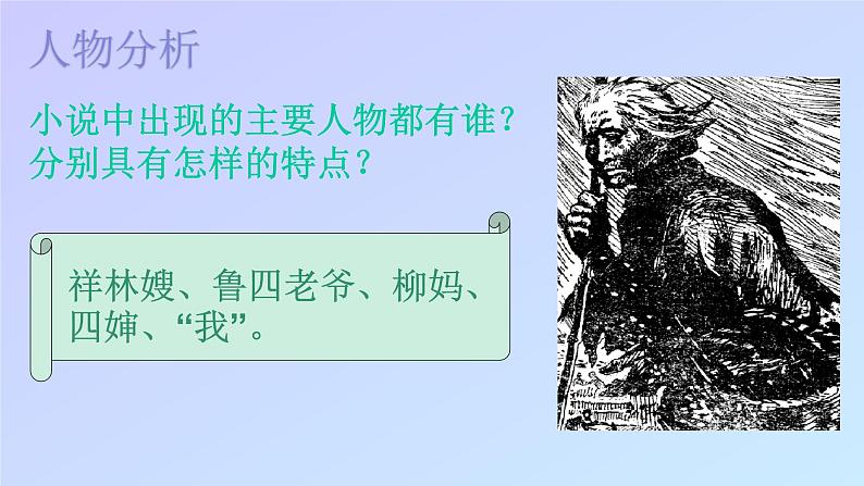 这是一份高中语文人教版 (新课标)必修三2 祝福教学ppt课件,共34页。PPT课件主要包含了第一课时,整体把握认识祥林嫂,第二课时,没有春天的女人,祥林嫂形象小结,第三课时,鲁四老爷形象小结,柳妈形象小结,第四课时等内容,欢迎下载使用。