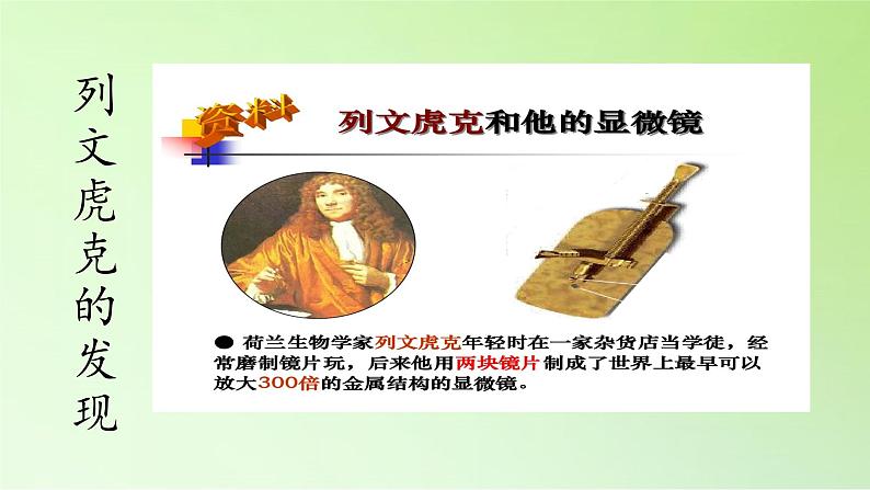 这是一份小学科学教科版六年级下册4、怎样放得更大课堂教学课件ppt,共14页。PPT课件主要包含了列文虎克的发现,制作简易显微镜,显微镜下的微小世界等内容,欢迎下载使用。